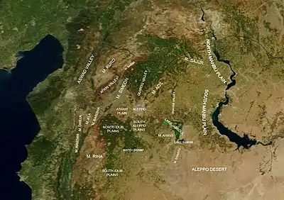 La meseta de Alepo se encuentra en el norte de la conjunción téctonica de la placa arábiga y la placa africana (el denominado Rift de Mar Muerto).