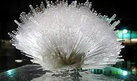 Hábito cristalino En masa compacta porcelanosa, cristales prismáticos largos, o acicular en manojos de fibras esféricos