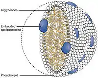 Los contenidos de estas micelas (aunque no las sales biliares) entran a los enterocitos (las células epiteliales que recubren el interior del intestino delgado) donde son resintetizados como triglicéridos, y empacados dentro de quilomicrones que son liberados hacia los lacteales (los capilares del sistema linfático de los intestinos).[20] Estos lacteales drenan hacia el ducto toráxico el cual drena hacia la sangre venosa a la altura de la unión de las venas yugular izquierda y subclavia izquierda en la parte izquierda baja del cuello. Esto significa que los productos grasos solubles de la digestión son descargados directamente en la circulación general, sin pasar primero por el hígado, como lo hacen todos los otros productos. La razón de esta particularidad, todavía es desconocida.[21]