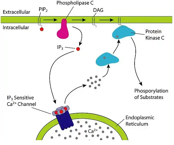 3 estimula la liberación de iones calcio del retículo endoplasmático liso, mientras que el DAG es un activador fisiológico de la proteína quinasa C (PKC), promoviendo su traslocación desde el citosol hacia la membrana plasmática. La PKC es una proteína quinasa multifuncional que es capaz de fosforilar residuos de serina y treonina en muchas proteínas blanco. Sin embargo la PKC solamente es activa en presencia de iones calcio, y es por eso que el DAG aumenta la afinidad de la PKC por el Ca2+