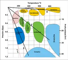 Se denominan facies metamórficas a los conjuntos de rocas que presentan una repartición mineral idéntica para una composición química global idéntica.[34] Los cambios en la mineralogía de una roca metamórfica se deben a variaciones de la presión y de la temperatura, por lo que el reconocimiento de los minerales nos va a dar una indicación de la presión y temperatura reinante en el momento de la formación de la roca.[35] Las facies metamórficas se pueden también correlacionar con el gradiente geotérmico presente cuando la roca se metamórfico.[32] Las facies se definen para cambios mayores en rocas de composición basáltica.[11] Es posible hacer subdivisiones de las facies, tanto para rocas basálticas como para otros tipos, pero es poco práctico al complicar mucho el esquema de facies.[11] Las diez facies metamórficas son (en negrita, los minerales diagnósticos):[11]