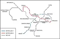 Se proyectaron dos líneas, con 43 estaciones, conectadas al sistema BG Voz. La línea 1 debería comenzar en Železnik y terminar en Mirijevo, mientras que la línea 2 comenzará en Mirijevo y terminará en Zemun.[71] También se propuso construir en el futuro una tercera línea desde Banjica.[72] El teniente de alcalde Goran Vesić también anunció una tercera línea, pero desde Voždovac hasta la nueva estación de tren de Belgrado,[73] para conectar el sistema con la estación de tren del centro de Belgrado, ya que las dos primeras líneas la rodean por completo. Sin embargo, la ministra de Transportes, Zorana Mihajlović, afirmó que la Línea 3 no es "objeto de conversaciones" con las empresas francesas.