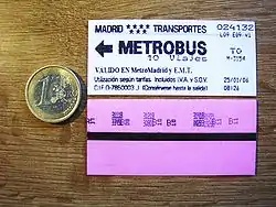 El billete consiste en un cartón de 66 milímetros de ancho por 30 mm de alto y 0,27 mm de grosor (formato Edmondson).[2] En la cara anterior se puede leer el nombre del título en letras mayúsculas, la tarifa aplicada, y si el billete ha sido adquirido en una máquina expendedora de la red de metro, la línea, la estación (en número), la fecha y hora de compra. Por ejemplo, el billete de la fotografía ha sido adquirido en la estación de la línea 9 Cruz del Rayo (estación n.º 9), el 25 de enero de 2006 a las 8:26 h con la tarifa T0.