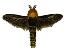 La envergadura es de unos 30 mm para los machos. Los machos adultos tienen alas negras, una cabeza peluda anaranjada y un abdomen con bandas negras y anaranjadas. Las hembras adultas no tienen alas y permanecen en el saco de las larvas. Son de color blanco con la cabeza marrón y alcanzan una longitud de unos 30 mm.[3]