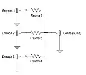 Estos sencillos sumadores aditivos se basan en la ley de Kirchoff que suma en un nodo la corriente que aporta cada entrada, (correspondiente a la resistencia de cada una). Solo suma las amplitudes y la salida solo contiene las frecuencias de las señales originales.[3]