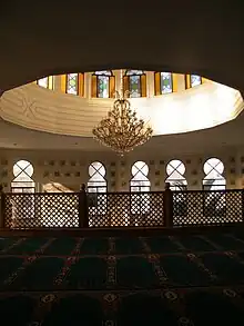 El salón principal en ambos niveles se encuentra cubierto por una gran alfombra de color verde y sandía, simbolizando un arco lobulado, el que indica el lugar para posarse y dirección a Makkah. En la parte superior, es decir, como remate de la doble altura se sitúa la cúpula de cobre, que junto al minarete, poseen una luna en la cumbre. Esto es un elemento característico de la arquitectura islámica, ya que los musulmanes se rigen por el calendario lunar, el cual toma en consideración tanto las fases del sol como de la luna. Por esta razón las construcciones islámicas adoptan este símbolo, para así, destacar y diferenciarse del resto de construcciones.