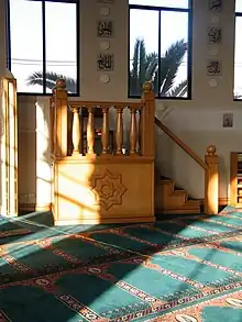 El ángulo que se genera en la intersección de las calles, es paralelo al que se genera con los muros de la mezquita, a los cuales se les llama la qibla, este se encuentra en el lugar más visible del salón. En el centro de la qibla se ubica el mihrab decorado con mosaicos. Este pequeño ábside indica la dirección a la Meca, es decir, la orientación donde los fieles deben efectuar su oración. A su lado se ubica el Mimbar, donde el imán se dispone a dirigir la oración.
