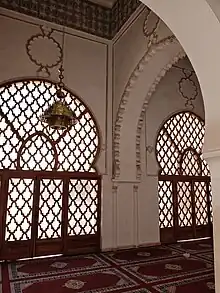 La nave transversal que corre a lo largo del muro de la alquibla (sureste) está delimitada del resto de la sala de oración por otra hilera de arcos perpendiculares a los demás, mientras que los arcos situados junto al mihrab presentan un perfil "lambrequín" (contorno con puntas y lobulado común en la marroquí y arquitectura morisca) con [[intradós] tallados en mocárabes.] [6] El mihrab propiamente dicho es una alcoba arqueada con una pequeña cúpula de mocárabes. La pared que lo rodea está cubierta de decoración tallada en estuco con arabescos, patrones geométricos islámicos y caligrafía árabe. El espacio entre los arcos delante del mihrab también está cubierto por encima por una gran cúpula cuadrada de finos mocárabes.[6] La parte inferior del mihrab también está decorada con ocho columnas embutidas en una disposición simétrica alrededor de la abertura del mihrab. A diferencia de la mayoría de los ejemplos anteriores, que solían estar tallados en estuco o yeso, las columnas y sus capiteles son de mármol. Las superficies de las columnas están talladas con arabescos e inscripciones árabes, mientras que los capiteles presentan arabescos ornamentados y formas de mocárabes que recuerdan a los capiteles decorativos otomanos de la época.[6]