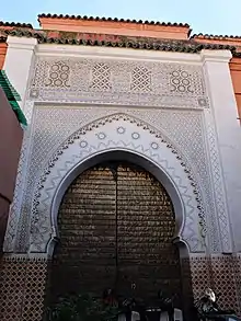 La mezquita tiene tres entradas principales: una al norte, alineada con el eje central principal del edificio, que da al patio, y dos entradas laterales simétricas al oeste y al este que dan al borde norte de la sala de oración. El portal exterior de las entradas suele estar resaltado con más decoración de estuco, mientras que el espacio justo dentro de cada entrada está cubierto por una cúpula de mocárabes (escultura parecida a la estalactita).[6][8] El arco central del lado sur del patio está cubierto en parte por una pantalla de madera llamada anaza' que cubre la entrada al pasillo que conduce al mihrab central (hornacina que simboliza la dirección de la oración) y también actúa como "mihrab auxiliar" para quienes realizan sus oraciones en el patio.[8][6]