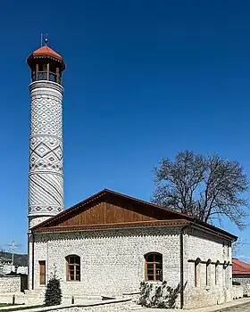 La mezquita Saatli fue construida en 1883 por el arquitecto azerbaiyano, Karbalayi Safikhan Karabakhi.[3] La mezquita tiene una sala de oración de tres naves y dos minaretes de ladrillo con una decoración especialmente estampada específica de la arquitectura de Karabaj.[4]