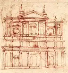 El nuevo papa León X ya no era ajeno a Miguel Ángel, siendo Giovanni de Médici su antiguo compañero, segundo hijo de Lorenzo el Magnífico. Desde que León fue considerado un Médici, uno de sus proyectos fue terminar la decoración de la iglesia de su familia en San Lorenzo, Florencia.[8] El predecesor del artista, Brunelleschi, terminó el interior, él se encargó de la fachada. De hecho, León X invitó a varios arquitectos para realizar ese trabajo y no se encontraba entre sus favoritos. Aun así, cuando León X tomó la decisión, Miguel Ángel fue aceptado para el trabajo. En anticipación al proyecto, fue a las canteras de Carrara, Italia, para extraer granito y pasó 2 años construyendo un camino hacia allí, supervisando la extracción y transportando el mármol a Florencia. La fachada de la iglesia fue, de hecho, el primer trabajo del artista en el campo de la arquitectura, no tenía experiencia alguna en establecer planes de trabajo ni las medidas necesarias para este proyecto. Además, los bloques de mármol usados en las columnas, cornisas y otros elementos arquitectónicos eran diferentes de los que él había usado en sus esculturas anteriormente.[9]