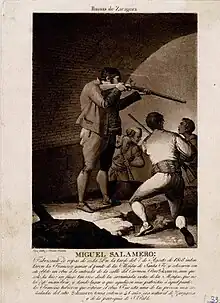 ![]() Miguel Salamero, aguafuerte y aguatinta de Juan Gálvez y Fernando Brambila para la serie Ruinas de Zaragoza. Inscripción: «MIGUEL SALAMERO: Fabricante de ropas de seda. En la tarde del 7 de Agosto de 1808 intentaron los franceses ganar el punto de las Monjas de Santa Fé, y colocaron con este objeto un obús a la entrada de la calle del Carmen. Pero Salamero, aun que solo, les hizo un fuego tan vivo desde las arruinadas vistas de las Monjas, que no los dejó maniobrar; y dando lugar a que acudiesen mas patriotas á aquel punto, los Franceses tubieron que retirar el obus. Fue esta una de las proezas mas señaladas del sitio. Salamero tenía entonces 48 años, era natural de Zaragoza y de la parroquia de S. Pablo». Biblioteca Nacional de España. | ||