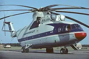 El Mil Mi-26 o Mi-26 (en ruso: Миль Ми-26, designación OTAN: «Halo»[4]) es un helicóptero soviético y ruso, con capacidad de elevar hasta veinticuatro toneladas y transportarlas a más de 800 kilómetros. Voló por primera vez en 1977 y su producción en cadena comenzó en 1981 en la fábrica de helicópteros Mil de Moscú y actualmente continua evolucionando con 316 helicópteros construidos a fecha de 2019.[5]