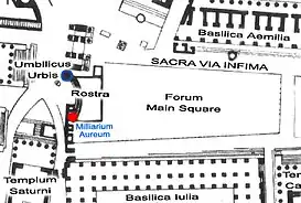 ![]() Plano del Foro Romano con el Milliarium Aureum en rojo y el Umbilicus Urbis en azul. | ||