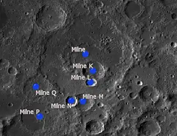 Por convención estos elementos son identificados en los mapas lunares poniendo la letra en el lado del punto medio del cráter que está más cercano a Milne.