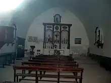 «El espacio interior viene conformado por una nave única, piso cementado y techo arqueado. Las paredes se hallan jalbegadas, en agudo contraste con el zócalo, pintado en tonos oscuros. En la cabecera hay una mesa de altar exenta y otra adosada de obra, sobre la que se ubica un sencillo retablo. El conjunto está encajado en el mismo paramento del testero, con tres huecos separados por cuatro columnas lisas con capiteles labrados y adornos ovalados en la parte alta: la cavidad central luce un Cristo crucificado y las laterales imágenes de santos. Sobre la cornisa hay otro vano centrado, con una imagen de santa Bárbara mostrando sus atributos: palma del martirio, espada y torre almenada».[20]Desde el Rincón de Ademuz, Alfredo Sánchez Garzón