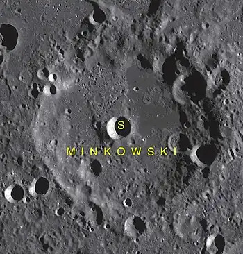 Minkowski es un cráter de impacto perteneciente a la cara oculta de la Luna, en las latitudes más bajas del hemisferio sur. Se halla alrededor de un diámetro de distancia al norte-noreste del cráter Lemaître, una formación de un tamaño parecido. Al noroeste de Minkowski aparece el cráter inundado de lava Baldet, y al sureste se encuentra Fizeau.