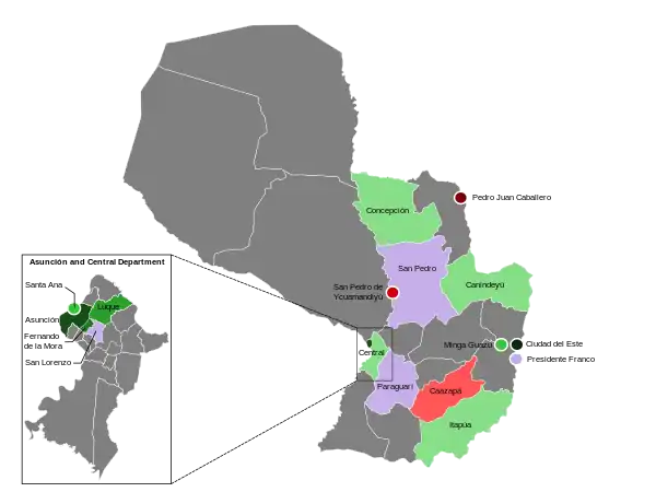 | Retirados | Areguá, Arroyos y Esteros, Capiatá, Colonias Unidas, Coronel Oviedo, Encarnación, General Artigas, Hernandarias, Itauguá, Mariano Roque Alonso, Comunidad de paraguayos en España, Villarrica | ||||