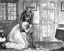 Hacía ya mucho tiempo que yo estaba encerrada en estas habitaciones ─contestó en voz baja y precavida─. No sé cuánto tiempo hacía, porque, como sabes, los relojes están parados. Entonces le dije que necesitaba una niña para educarla y amarla y para evitarle mi triste suerte. Le vi por vez primera cuando le mandé llamar a fin de que me preparase esta casa y la dejara desocupada para mí, pues leí su nombre en los periódicos antes de que el mundo y yo nos hubiésemos separado. Él me dijo que buscaría una niña huérfana; y una noche la trajo aquí dormida y yo la llamé Estella.[1]