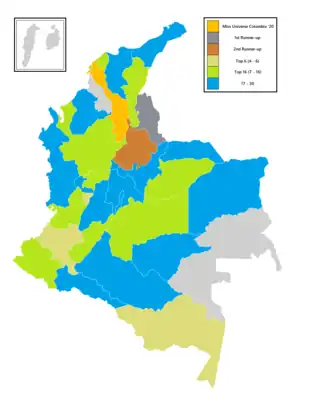 | Debutantes | Amazonas, Antioquia, Arauca, Atlántico, Bogotá D.C, Bolívar, Boyacá, Caldas, Caquetá, Cartagena, Casanare, Cauca, Cesar, Chocó, Córdoba, Cundinamarca, Guaviare, Huila, La Guajira, Magdalena, Meta, Nariño, Norte de Santander, Putumayo, Quindío, Risaralda, Santander, Tolima, Valle del Cauca, Vichada. | ||||
