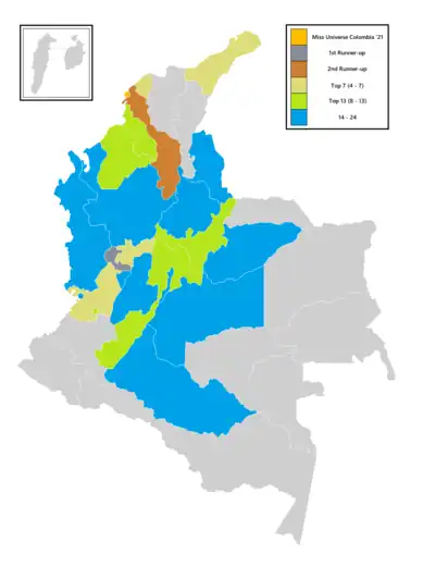 •  Cartagena - Valeria María Ayos Bossa[7] participaría en la edición anterior como Miss San Andrés 2020, pero por motivos de salud se retiró de la competencia, este año regresa y se le otorga por parte de la organización nacional el derecho de participar con la banda de Miss Cartagena 2021.