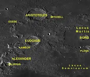 ![]() Imagen de la misión Lunar Orbiter 4 de Aristoteles (cráter más grande) y de Mitchell (a la derecha) | ||