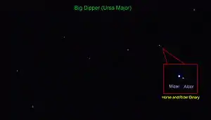 Con buena vista se puede distinguir una compañera más débil al este de Mizar, denominada Alcor (80 Ursae Majoris). El poder distinguir a simple vista ambas estrellas constituye un ejercicio clásico de agudeza visual. La separación real entre Mizar y Alcor es de un cuarto de año luz y, aunque sus movimientos propios indican que se mueven juntas, no está claro si forman un sistema binario o si sólo es una estrella doble óptica, como se había pensado hasta ahora.