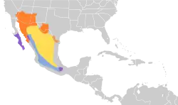 Es nativo del sur de los Estados Unidos y de México. Vive en diferentes biomas incluyendo bosque subtropical y tropical, matorrales y sabanas.[1] A menudo se encuentran en hábitats de chaparral, y se encuentran con facilidad durante su época de reproducción.