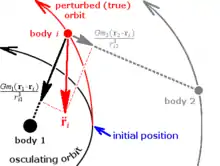 que, en teoría, podría integrarse dos veces para encontrar . Dado que la órbita de osculación se calcula fácilmente mediante métodos de dos cuerpos, se toman en cuenta y y se puede resolver . En la práctica, la cantidad en los corchetes, , es la diferencia de dos vectores casi iguales, y es necesaria un número mayor de cálculos para evitar la necesidad de utilizar numerosas cifras significativas adicionales.[8][9]