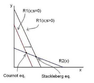 - Se necesitan supuestos matemáticos adicionales en la función recíproca de la demanda y las funciones de costos para asegurar que las condiciones susodichas definen un máximo y que la pendiente de las funciones de reacción es descendente (elecciones son "sustitutos estratégicos") y que se cruzan. El gráfico ilustra el caso de la demanda lineal de la forma .