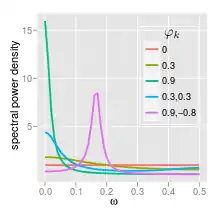 Si hay un solo pico espectral a f = 0, a menudo referido como ruido rojo . Como \ Varphi_1 se convierte más cerca de 1, hay poder más fuerte en las frecuencias bajas, el tiempo es decir, más grande se queda. Se trata entonces de un filtro de paso bajo, cuando se aplica a la luz de espectro completo, todo a excepción de la luz roja se filtra. Si hay un mínimo en f = 0, a menudo referido como ruido azul . Esta forma similar actúa como un filtro de paso alto, todo a excepción de la luz azul se filtra.
