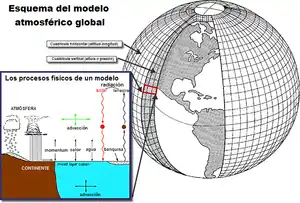 Un modelo climático es una representación de los procesos físicos, químicos y biológicos que afectan el sistema climático.[3] Los modelos climáticos usan métodos de investigación cuantitativa para simular las interacciones de la atmósfera terrestre, los océanos, el relieve terrestre y el hielo. Se utilizan para el estudio de la dinámica del sistema meteorológico y climático para las proyecciones del clima futuro.
