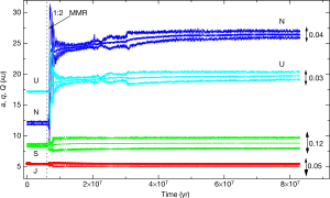 Finalmente, los planetas gigantes alcanzarían sus semiejes mayores orbitales actuales, y la fricción dinámica con el disco planetesimal restante amortiguaría sus excentricidades, obligando a que las órbitas de Urano y Neptuno fuesen circulares nuevamente.[10]