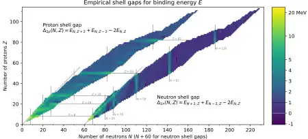 Las capas de protones y neutrones son independientes entre sí. Por lo tanto, pueden existir tanto "núcleos mágicos", en los que un tipo de nucleones u otros cuya cantidad aparece en un número mágico, como "núcleos cuánticos doblemente mágicos", en los que ambos tipos lo están. Debido a las variaciones en el llenado orbital, los números mágicos superiores son 126 y, especulativamente, 184 para los neutrones, pero solo 114 para los protones, lo que determina un factor clave en la configuración de las denominadas islas de estabilidad. Se han encontrado algunos números semimágicos, en particular Z = 40, que proporciona el relleno de la capa nuclear para los distintos elementos. El 16 también puede ser un número mágico.[3]