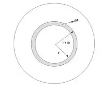 Dentro de la estrella, considere que la frontera interna del cascarón delgado, que constituye una esfera de radio , encierra una cantidad de materia , y que su frontera externa situada a una distancia del centro, contiene una masa . La cantidad de masa dentro de un cascarón, , puede ser calculada en términos de la definición habitual de densidad, masa sobre volumen, y de la simetría esférica asumida: