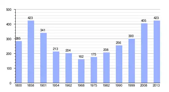 Los datos demográficos contemplados en este gráfico de la comuna de Mognard[4] se han cogido de 1800 a 1999 de la página francesa EHESS/Cassini, y los demás datos de la página del INSEE.[5]
