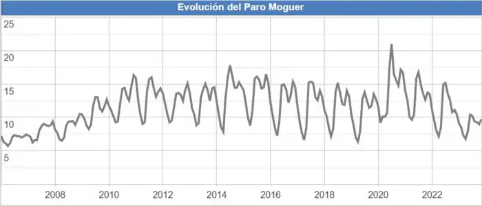 | Gráfica de evolución demográfica de Moguer entre 2014 y 2023 |