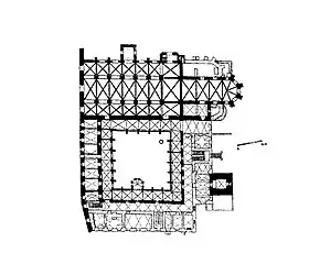 En definitiva el monumento arquitectural más valioso es la pared interior del claustro que contiene las pinturas ya mencionadas y además unos vestigios de pórticos originales, nichos y sobre todo las ventanas con la división de metal conservada. Algunos campos determinados de bóveda y de consolas contuvieron la ventana a la derecha y el pórtico al lado, el resto del campo era decorado de las pinturas murales.