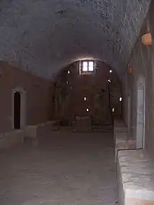 Antes de 1866, el polvorín estaba en la parte sur del recinto.[44] Poco antes del ataque de los turcos, y por miedo a que pudieran atravesar fácilmente las paredes de la sala y hacer estallar el monasterio con la munición, ésta fue desplazada a la bodega, que estaba unos 75 centímetros por bajo en comparación con el depósito original, lo que garantizaba una mayor seguridad.[44] El polvorín era alargado y arqueado. Con una longitud de 21 metros por 5,40 metros de ancho, esta parte del monasterio fue completamente destruida en la explosión de 1866, con la excepción de una pequeña parte de la bóveda en la parte este.[45]
