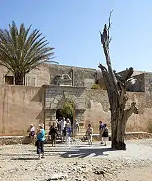 La puerta central del monasterio se encuentra al lado oeste del recinto. Lleva el nombre de Rethemniotiki o Haniotiki, por su orientación hacia las dos ciudades. La puerta original fue construida en 1693 por el hegúmeno Néophytos Drossas. Un manuscrito conservado en el monasterio incluye una descripción de la puerta, detallando su aspecto antes de que fuera destruida en 1866 durante el asalto de los turcos. Compuesta de piedras cuadradas, tiene dos ventanas superiores, ornamentadas por frontones piramidales y enmarcados por columnas estriadas adornadas con leones. En el frontón de la fachada, se podía leer la inscripción:Señor, vela por el alma de tu siervo, hegúmeno Néophytos Drossas, y la de todos nuestros hermanos cristianos.[nota 7] El aspecto general de la vieja puerta se mantuvo con dos ventanas superiores, enmarcadas por dos columnas. Pero la inscripción en honor de Drossas, los frontones piramidales y los leones no han sido reconstruidos.