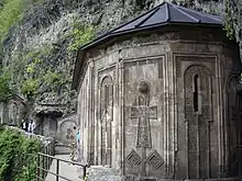 En el lado opuesto del portal de la cueva hay una pequeña iglesia de salón, dedicada a Santa Catalina. Su techo y pared oeste están excavados en roca, con la fachada construida con losas de piedra labrada. Existe una escultura en relieve de la cabeza de un carnero en la pared oriental y frescos en la pared exterior del sur. Ambas iglesias están ricamente adornadas con esculturas de piedra adornadas, que incluyen arcos decorativos, marcos de ventanas y puertas, cruces esculpidas y cornisas caladas. A pesar del valor artístico de los elementos individuales en la escultura arquitectónica de Mghvimevi, los edificios del monasterio carecen de la integridad general y artesanía característica de los monumentos contemporáneos de la Georgia medieval.[2][3]