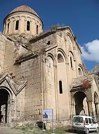 4. Ошки — грузинский средневековый монастырь (ныне на северо востоке Турции), один из духовно религиозных и культурных центров Грузии. Грандиозный собор (окончен между 958 и 961) трёхапсидное купольное здание, украшенное аркатурой, резными… (Encyclopaedic Dictionary)