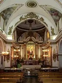 La iglesia actual fue realizada entre 1756 y 1774. Es de una sola nave y tiene capillas laterales comunicadas entre sí. La nave está dividida en cuatro tramos y cubierta con bóveda de cañón con lunetos. Su decoración, en estilo rococó, está realizada en yesería, e incluye pinturas dieciochescas. El presbiterio está coronado por una cúpula. Tras él se encuentra el camarín obra de Vicente Marzo, quien lo realizó entre 1794 y 1807. Presenta ocho columnas dóricas con molduras y cornisa sobre las que se desarrolla la bóveda rebajada con decoración dorada. Las pinturas de los muros y del techo están realizadas por Manuel Camarón Meliá y hacen referencia a la leyenda de San Miguel Arcángel.[1]