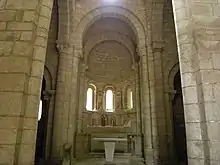 El ábside principal es prolongación de la nave principal y a ambos lados tiene sendos ábsides que cubren cada extremo de la nave transversal. Los ábsides están cubiertos con bóvedas en esfera mientras que la nave transversal lo hace con una bóveda de cañón. El crucero se cubre con una bóveda de medio cañón que descansa sobre cuatro arcos con columnas con capiteles muy decorados. Hay restos pictóricos del siglo XVI en los muros de los ábsides. En una de las capillas laterales hay un altar románico. En el ábside central se abren tes ventanas que quedan, al exterior, entre cuatro columnas adosadas al muro. Los canecillos que conforman el alero están ornamentados con motivos figurativos.