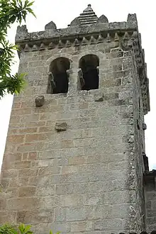 La torre del campanario de la iglesia conforma un elemento arquitectónico de singular interés y resulta absolutamente excepcional en las construcciones del protogótico gallego por su situación integrada en la cubierta norte del claustro. Su uso, además del de campanario, era el de vigilancia e incluso de defensa. En su base se ubica un locutorio utilizado para la lectura a la comunidad mientras realizan diferentes prácticas religiosas. Los arcos son apuntalados y los capiteles están adornados por motivos vegetales, hojas de acanto y arpías. Se remata el conjunto con un almenado y una cubierta en pirámide.