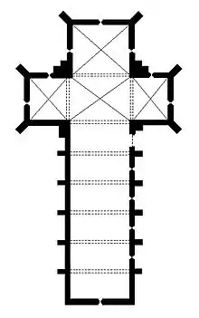 El templo es de finales del siglo XII. Tiene planta de cruz latina con una nave de seis tramos, con una bóveda de cañón apuntada y un ábside cubierto con una bóveda de crucería muy sencilla. La longitud total de la nave es de 42,5 m y su anchura de 10 m. El transepto mide 21,5 m. En el brazo norte del transepto y en el ábside, los nervios se cruzan en pequeños relieves con círculos que representan el Agnus Dei. Fue construida con un aparato de grandes sillares, bien escuadrados y pulidos.