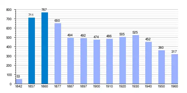 | Gráfica de evolución demográfica de Moncortés (Pdo.de Sor)[5] entre 1842 y 1960 |