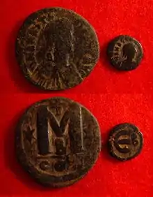 El inicio de lo que se conoce como moneda bizantina por los numismáticos comenzó con la reforma monetaria del emperador Anastasio I, el año 498,[1] que reformó la moneda del imperio romano tardío que consistía en sólidos de oro y nummi de bronce. El sestercio era una moneda de bronce muy pequeña, entre 8 y 10 mm de diámetro y un peso de entre 0,56 y una libra romana algo que era un gran inconveniente ya que se necesitaba un gran número de ellos incluso para hacer transacciones pequeñas.[2]