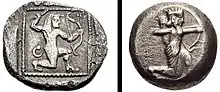 En cuanto a la tecnología de las monedas, ambas caras se grababan por separado. Estas primeras monedas tenían un reverso incuso grabado a golpe de punzón, mientras que los motivos del anverso consistían en una figura pictórica.[12] Las monedas de Lidia se acuñaban con un doble golpe de punzón en el reverso, una técnica que se simplificaría en la época de Darío I, en la que se usaba un solo golpe de punzón. Algunas de las primeras monedas de Licia bajo los aqueménidas también mostraban un diseño animal en el anverso y marcas de punzón incusas en el reverso que reproducían formas geométricas.[13][14]