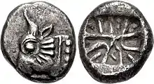 Moneda de Temístocles como gobernador aqueménida de Magnesia del Meandro. Letras ΘΕ en el reverso, iniciales del nombre (Θεμιστοκλῆς). Ca. 465-459 a. C.